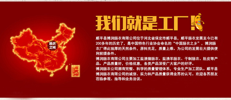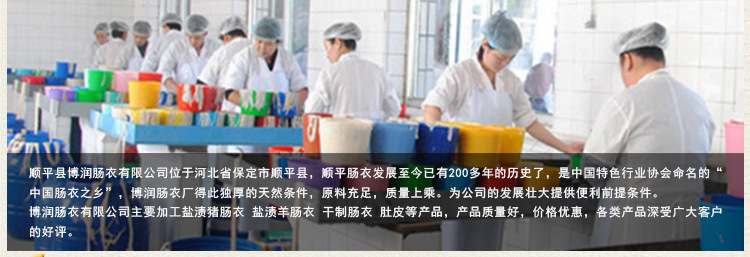 順平縣博潤(rùn)腸衣有限公司位于河北省保定市順平縣,順平腸衣發(fā)展至今已有200多年的歷史了,是中國(guó)特色行業(yè)協(xié)會(huì)命名的“中國(guó)腸衣之鄉(xiāng)”,博潤(rùn)腸衣廠得此獨(dú)厚的天然條件,原料充足,質(zhì)量上乘。為公司的發(fā)展壯大提供便利前提條件。